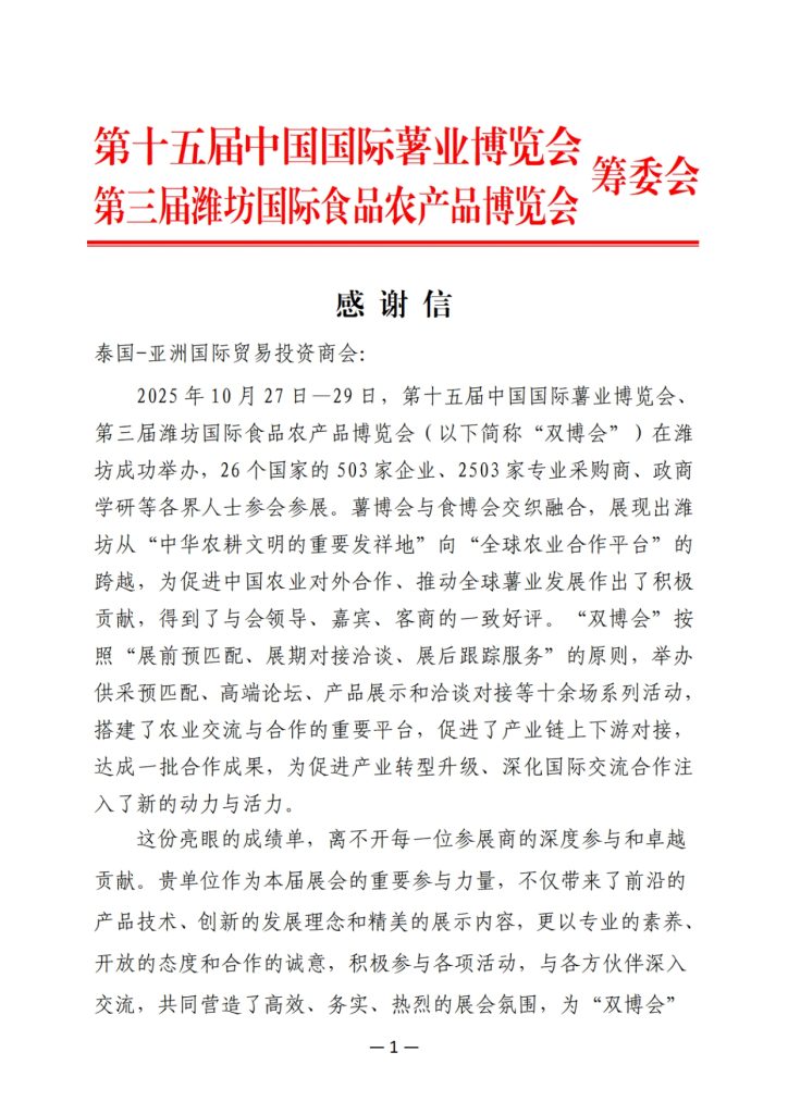 BANGKOK, November 27, 2025 – The Asian International Trade and Investment Association (AITIA) achieved significant success by leading a delegation of Thai entrepreneurs to participate in the 3rd Weifang International Agrifood Expo and the 15th China International Potato Expo (known as the ‘Double Expo’) in Weifang City, Shandong Province, People’s Republic of China, held from October 27 to 29, 2025. AITIA has now officially received a formal Letter of Appreciation dated November 10, 2025 , from the Organizing Committee, emphatically acknowledging the Association’s crucial role and the quality of its participation.