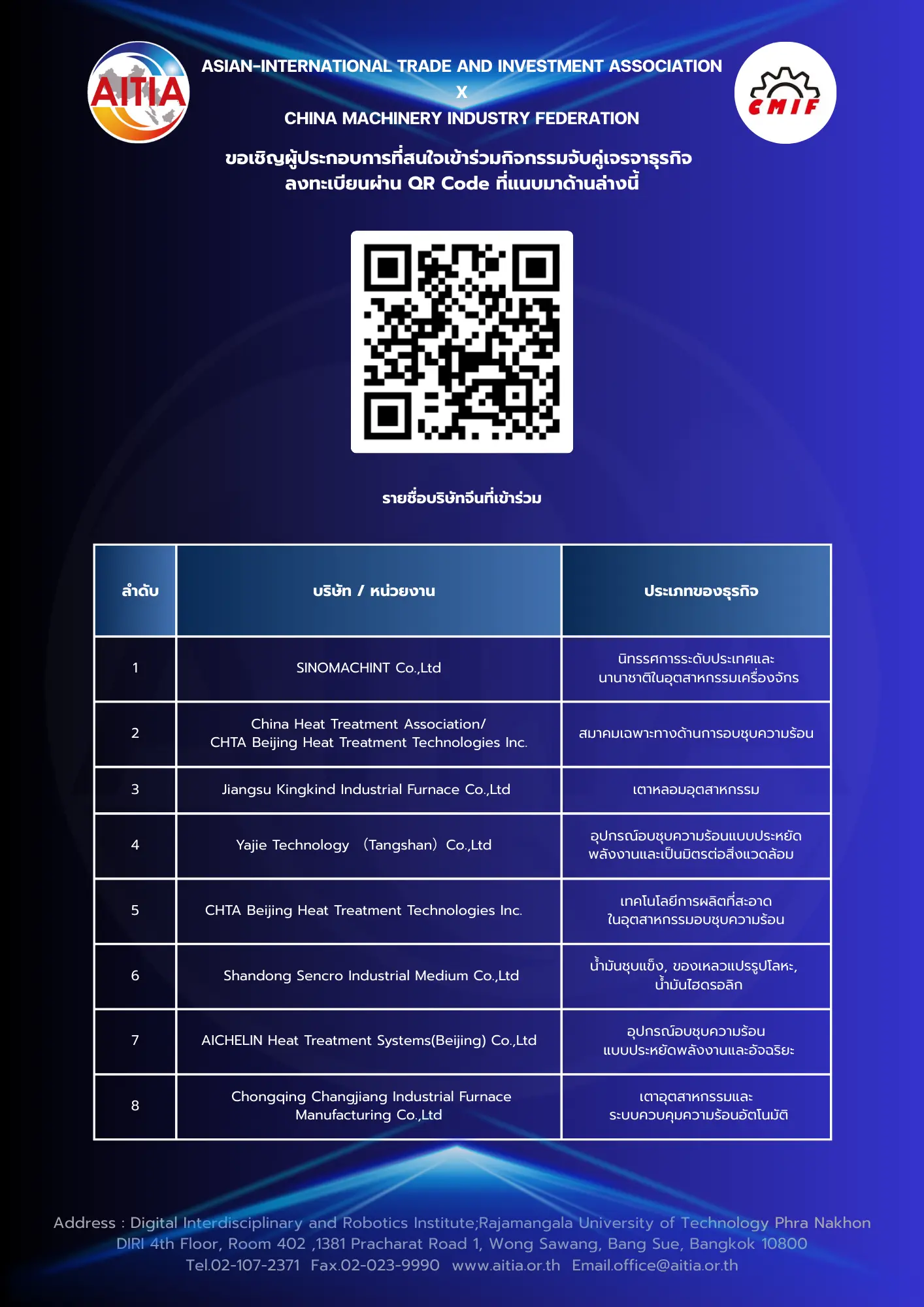 ทางสมาคมฯ ขอเรียนเชิญผู้ประกอบการในภาคอุตสาหกรรมเครื่องจักรและอุตสาหกรรมที่เกี่ยวข้อง เข้าร่วมกิจกรรมดังกล่าว และสามารถลงทะเบียนเพื่อร่วมกิจกรรม Business Matching ได้ผ่านช่องทางออนไลน์ที่ระบุไว้ด้านล่าง