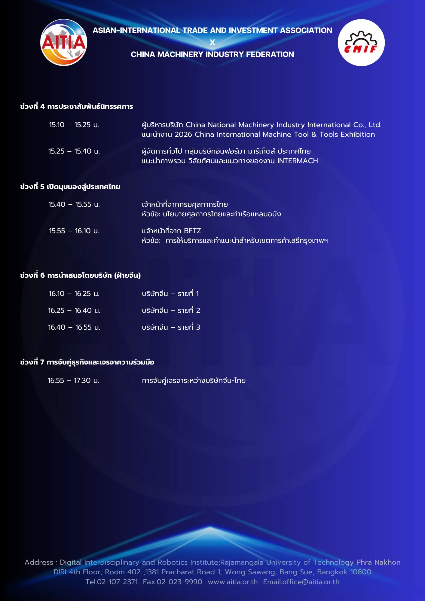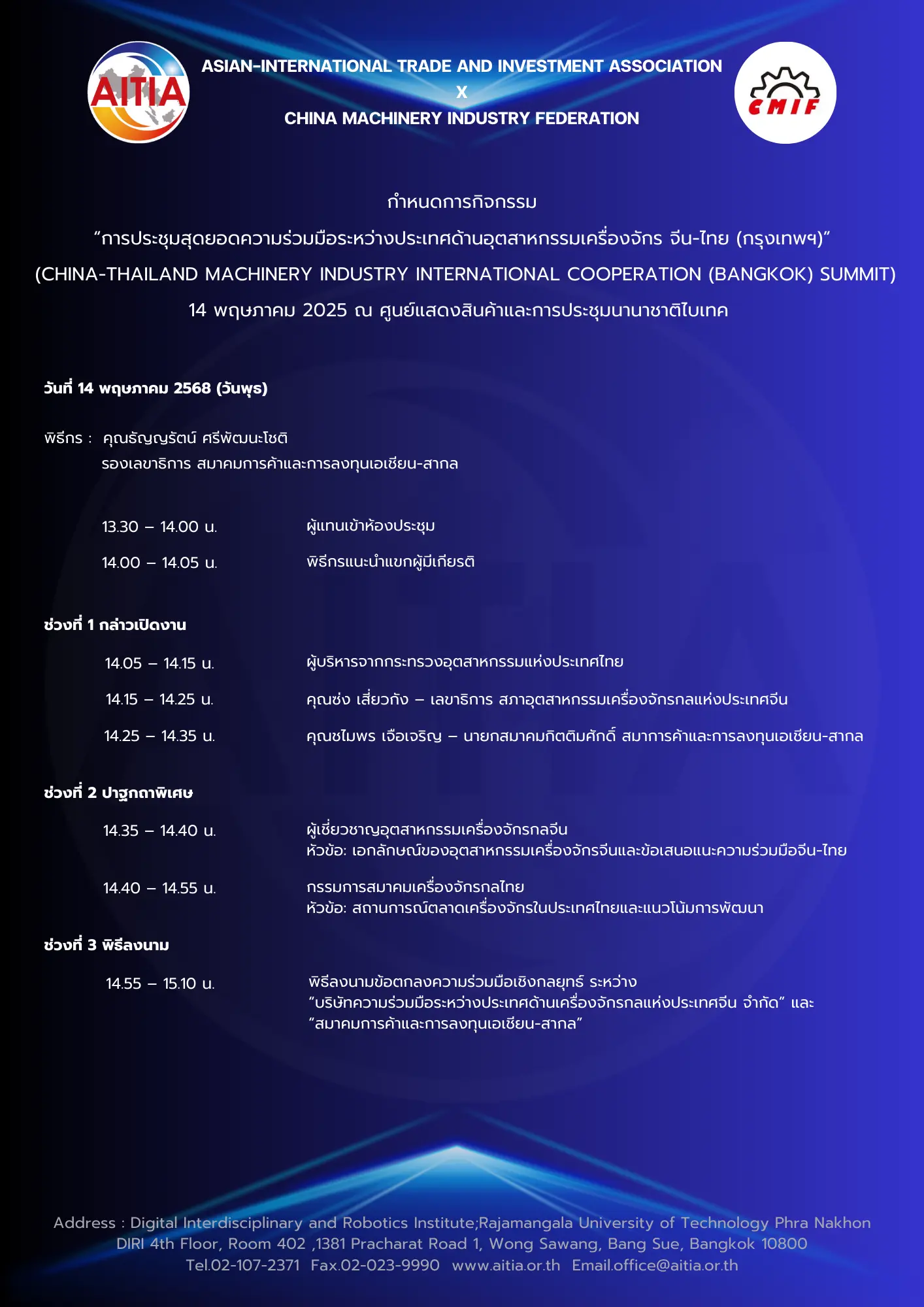 การประชุมครั้งนี้มีวัตถุประสงค์เพื่อส่งเสริมความร่วมมือระหว่างภาคอุตสาหกรรมเครื่องจักรของไทยและจีน เปิดเวทีแลกเปลี่ยนนโยบาย เทคโนโลยี และแนวทางการพัฒนาต่อยอดในระดับภูมิภาค โดยได้รับเกียรติจากหน่วยงานภาครัฐ สมาคมอุตสาหกรรม และผู้บริหารจากบริษัทผู้ผลิตเครื่องจักรชั้นนำของจีนเข้าร่วมกว่า 20 แห่ง